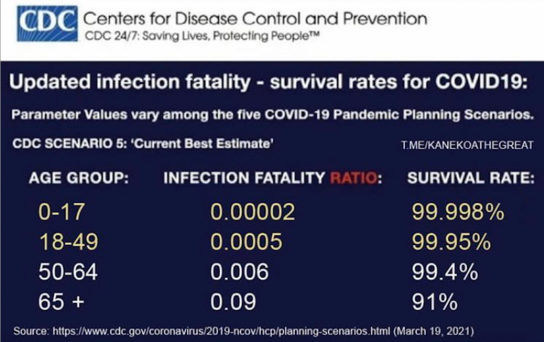 As at March 19/21, even with the doctored death numbers and flawed PCR tests, the CDC arrived at the following survival rates: