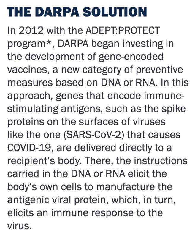 "In 2012 with the ADEPT:PROTECT program, DARPA began investing in the development of gene-encoded vaccines, a new category of preventive measures based on DNA or RNA. In this approach, genes that encode immune-stimulating antigens, such as the spike proteins on the surfaces of viruses like the one (SARS-CoV-2) that causes COVID-19, are delivered directly to a recipient’s body. There, the instructions carried in the DNA or RNA elicit the body’s own cells to manufacture the antigenic viral protein, which, in turn, elicits an immune response to the virus".